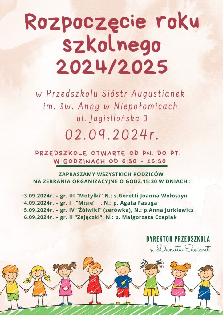 Rozpoczęcie roku szkolnego 2024/2025 2024-08-272024-08-27| 12:21 Categories: Aktualności Nawigacja wpisu PREVIOUS Previous post: Wakacje !NEXT Next post: Rekrutacja Related Post NASZE ZALETYNASZE ZALETY Zobacz więcej...Zobacz więcej... Przyjmujemy dzieci od 2,5 do 6 lat !!!Przyjmujemy dzieci od 2,5 do 6 lat !!! Zobacz więcej...Zobacz więcej... Rozpoczęcie nowego roku szkolengoRozpoczęcie nowego roku szkolengo Zobacz więcej...Zobacz więcej...