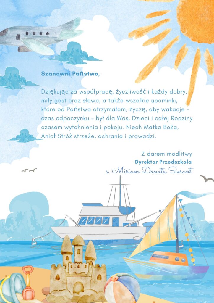 Wakacje ! 2024-07-032024-07-03| 11:43 Categories: Aktualności Nawigacja wpisu PREVIOUS Previous post: Dni Adaptacyjne – czerwiec 2024r.NEXT Next post: Rozpoczęcie roku szkolnego 2024/2025 Related Post Rozpoczęcie roku szkolnego 2024/2025Rozpoczęcie roku szkolnego 2024/2025 Zobacz więcej...Zobacz więcej... Przyjmujemy dzieci od 2,5 do 6 lat !!!Przyjmujemy dzieci od 2,5 do 6 lat !!! Zobacz więcej...Zobacz więcej... KLAUZULA INFORMACYJNAKLAUZULA INFORMACYJNA Zobacz więcej...Zobacz więcej...